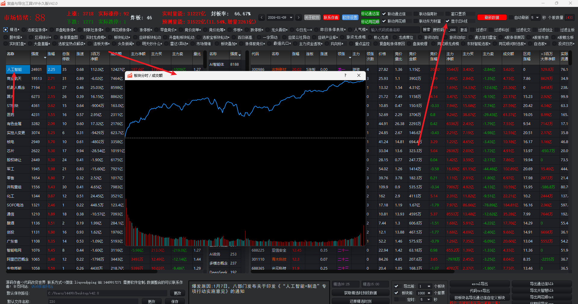 新增了板块题材以及连板数据。然后新增板块分时图和分钟成交额显示,如图所示